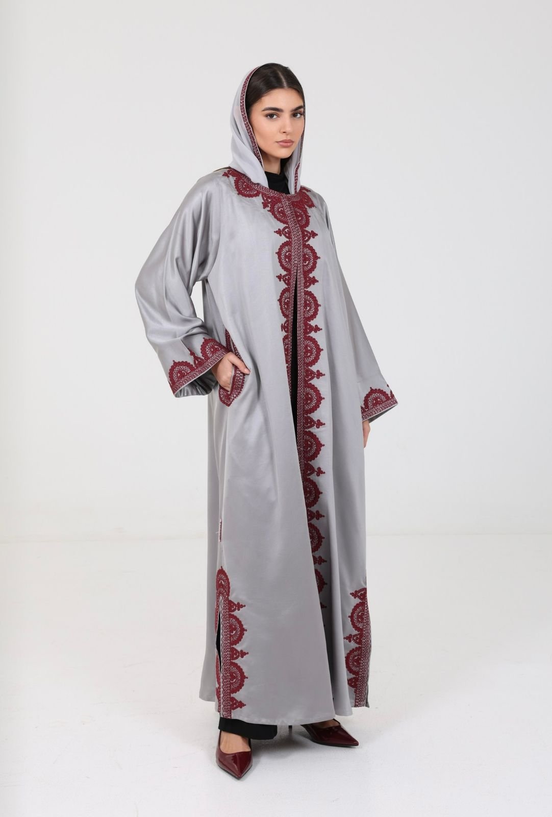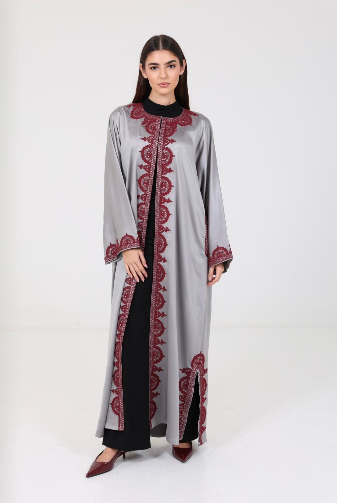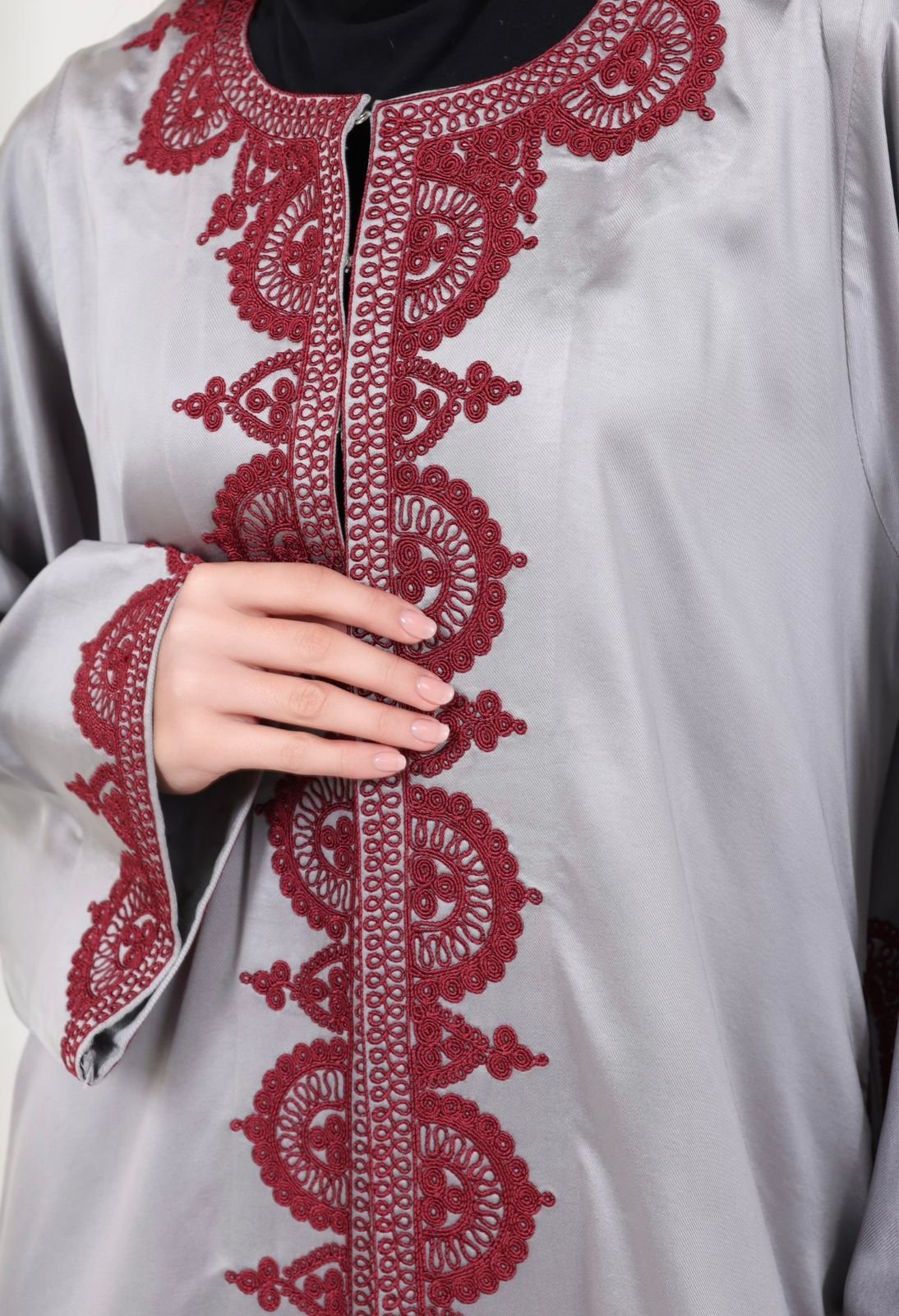اللون رمادي والتطريز مارون